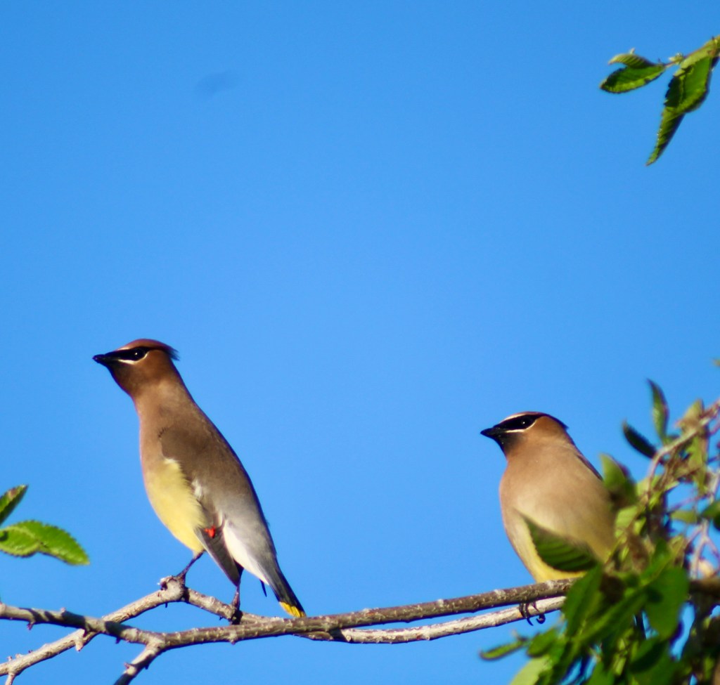 These two were Cedar Waxwings. There are actually three types of Waxwings, and these birds were given their name due to the red markings on their wings which looked like a smudge of sealing wax back in the day!